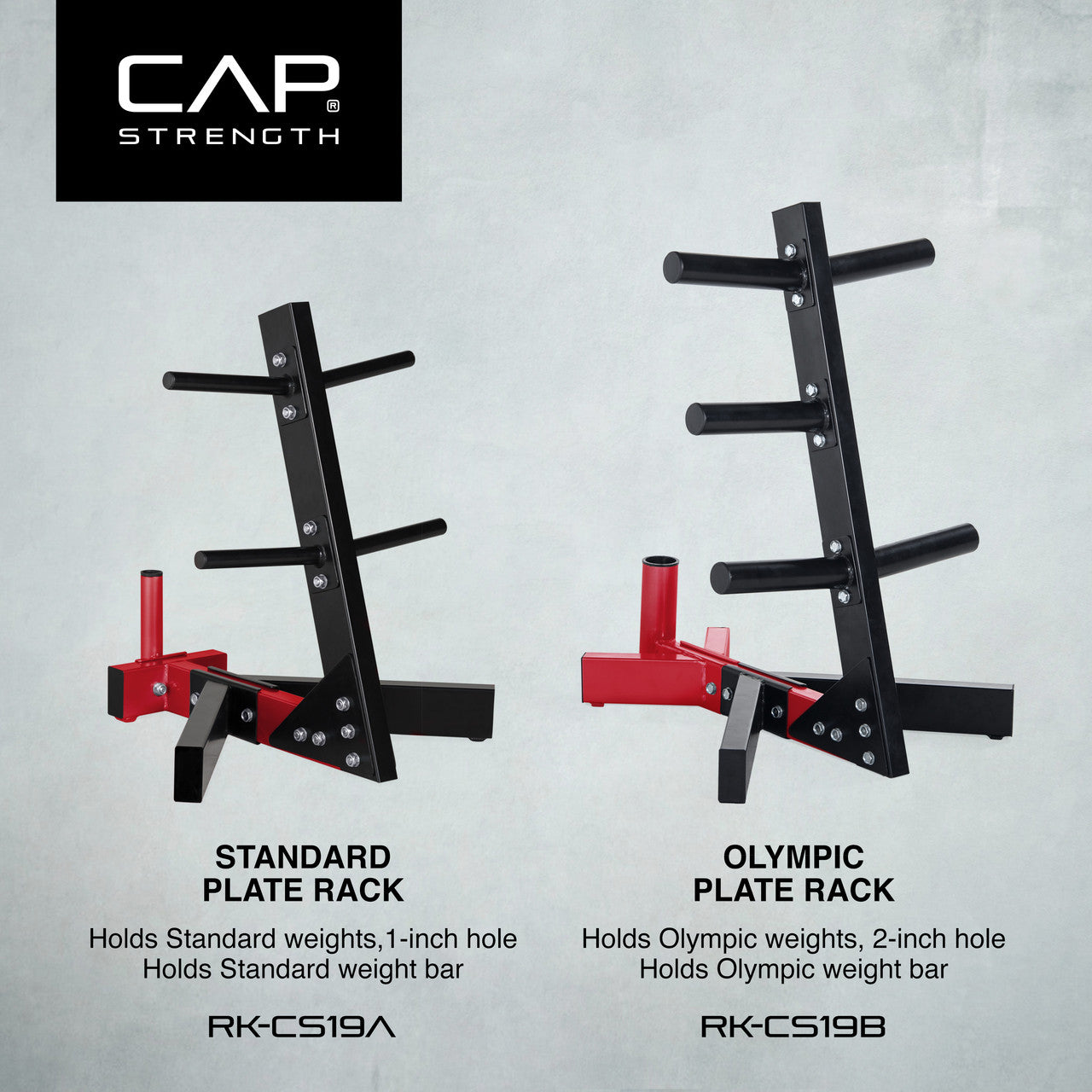 The RK-CS19B rack holds Olympic Plates with 2 inch holes, and the RK-CS19A rack holds Standard Plates with 1 inch holes.