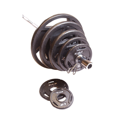 CAP's 300 lb Olympic Weight Set is made of solid cast iron and is extremely durable. If you're a beginner or an advanced fitness enthusiast, this set will check off all the requirements on your list. The set features several weight plates that allow you to create different weight combinations. This CAP 300 lb Olympic Weight Set includes a 7-ft Olympic bar, spring clip collars and the following weight plates: 2 x 45 lb, 2 x 35 lb, 2 x 25 lb, 2 x 10 lb, 4 x 5 lb, and 2 x 2.5 lbs.