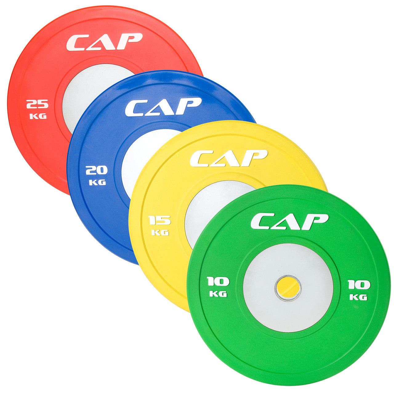 The CAP Olympic Rubber Competition Bumper Plates with Steel Inserts are competition quality and are color-coded by size. Use these high-end plates to practice at home, with the same quality you'll find in competitions. This CAP bumper plate offers protection for both the bar and the bumper plates with its sound construction. Steel hubs reinforce the holes and protect the bar at the same time. These plates can only be used with 2-in Olympic bars.Â