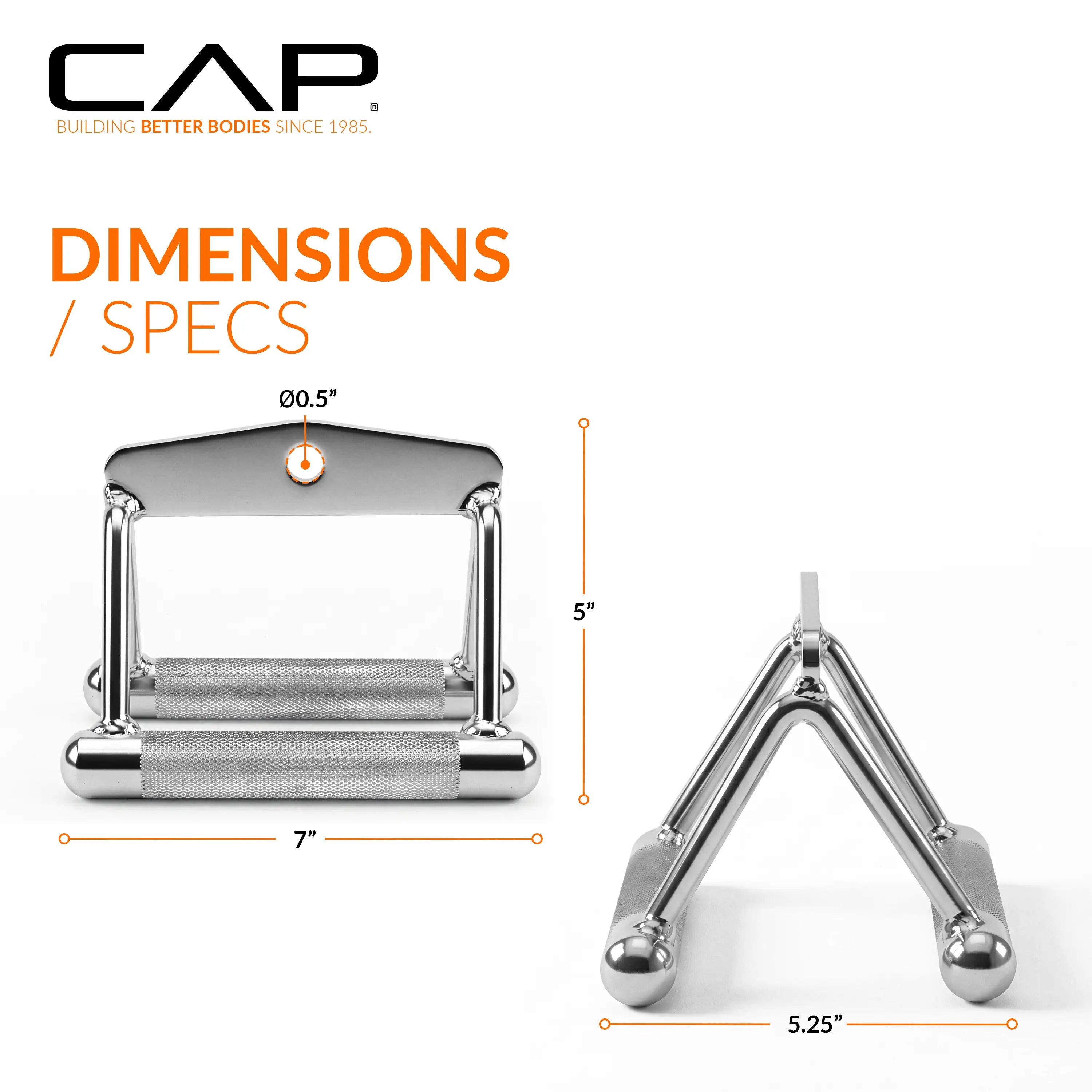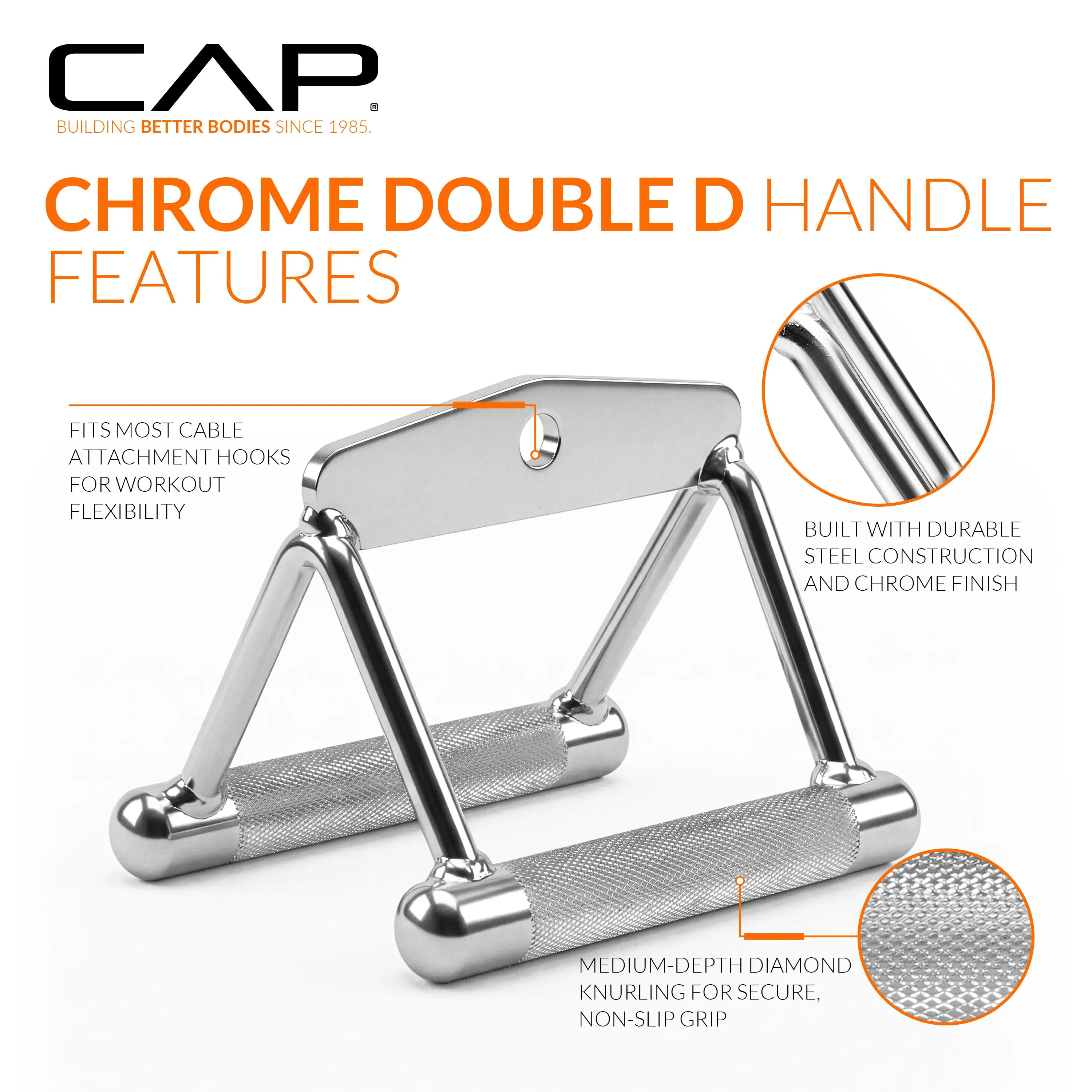 The CAP Solid Double D-Handle, constructed of solid steel with knurled hand grips, was designed for low row and upright row exercises. This bar offers better gripping power and is chrome plated for a high-end look. Attach the CAP Solid Double D-Handle to your home gym and start toning those back muscles.